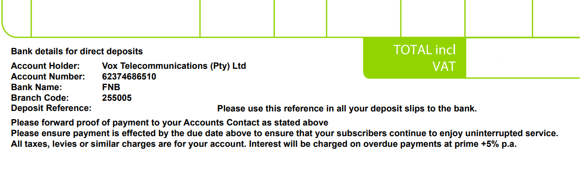 To ensure payments are allocated to the correct account, please use your Vox Account Number as the Beneficiary Reference.